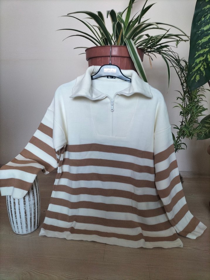 Çizgili Kahverengi-Beyaz Triko Kadın Kazak