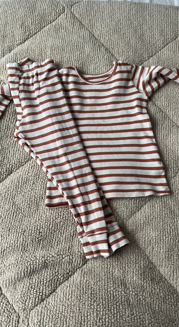 Uzun kollu, çizgili kahverengi ve beyaz çocuk atlet takımı, yumuşak kumaştan üretilmiştir.