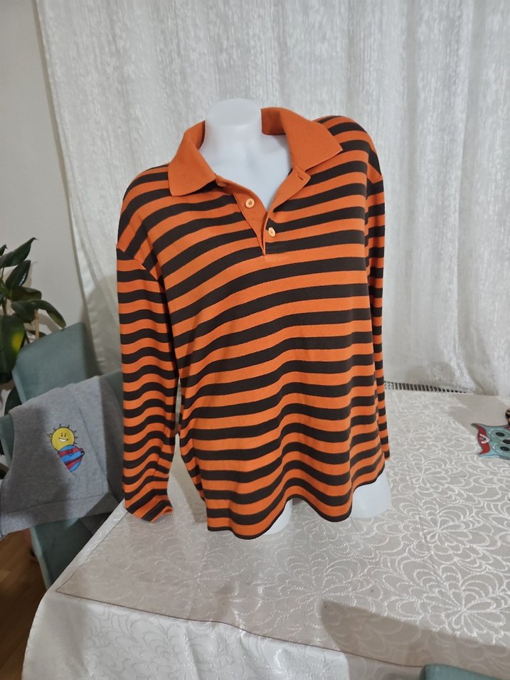 Düğmeli, uzun kollu, yakalı ve çizgili desene sahip kahverengi kadın kazak. Rahat kesimi ve triko kumaşıyla günlük sokak stiline uygundur. Marka temsili