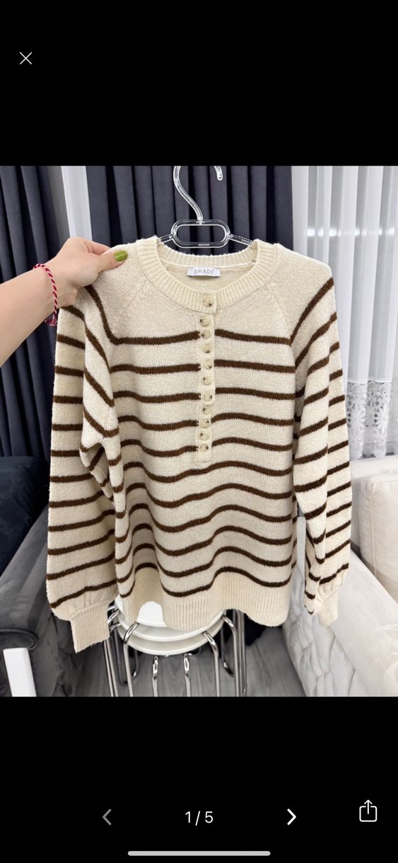 Bu ürünü gerçekten çok severek aldım çizgilisini de almıştım onu sattım. Çok az giyildi zaten belli oluyordur çok seviyorum bunları. Uzun kollu, bisiklet yaka ve kahverengi çizgili triko kumaştan yapılmış, bol kesim ve normal boyda kadın kazak.
