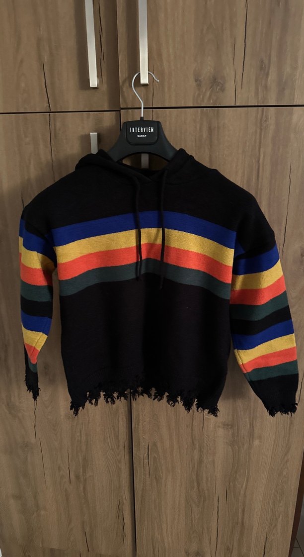 Uzun kollu, kapüşonlu ve bol kesim erkek çocuk kazağı. Örgü desenli, koyu renkli çok renkli çizgiler ve yumuşak, sıcak dokusu vardır. Eteği retro görünümlü, kasıntılıdır. İtalyan malı hiç giyilmedi