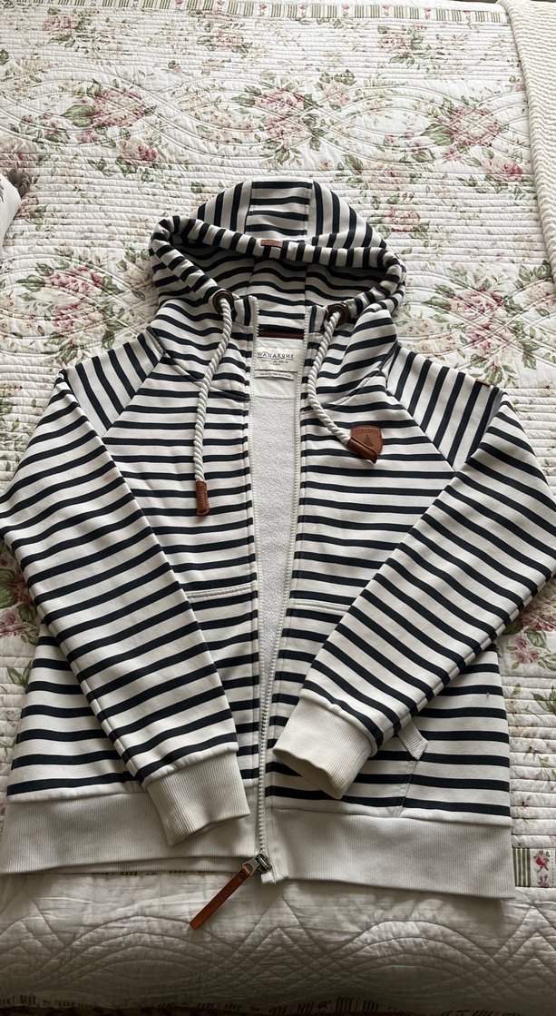 Uzun kollu, kapüşonlu ve fermuarlı bu kadın sweatshirtü, beyaz ve gri çizgili deseniyle, rahat sentetik kumaştan üretilmiştir. Günlük sokak tarzına uygundur.