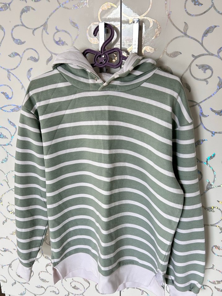 Yeşil ve beyaz çizgili, kapüşonlu ve uzun kollu, bol kesim örme sentetik kumaştan sweatshirt. Günlük kullanım için rahat ve şık.