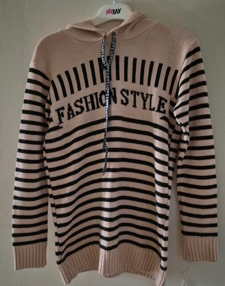 Siyah çizgili, uzun kollu, kapüşonlu ve rahat kesim triko kadın kazak. Göğüs kısmında yazı detayı bulunan, sokak tarzına uygun sıcak tutan bir model. Hafif yünlenme harici sorun yok.