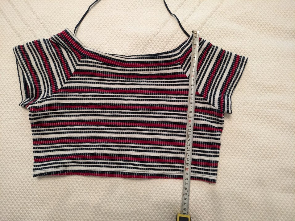 Çok renkli çizgili desene sahip, gri ve kırmızı tonlarında crop tişört. Kıyafetin ölçüleri beden üzerinde mezura ile gösterilmiştir.