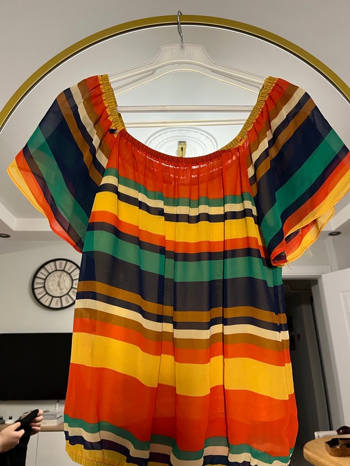 Kayık yaka ve kısa kollu, bol kesim kadın bluz. Canlı çok renkli çizgiler ve pile detayları ile sentetik kumaştan üretilmiştir. Rahat ve bohem tarz için uygundur. Şifon gömlek bluz içinde atleti de var