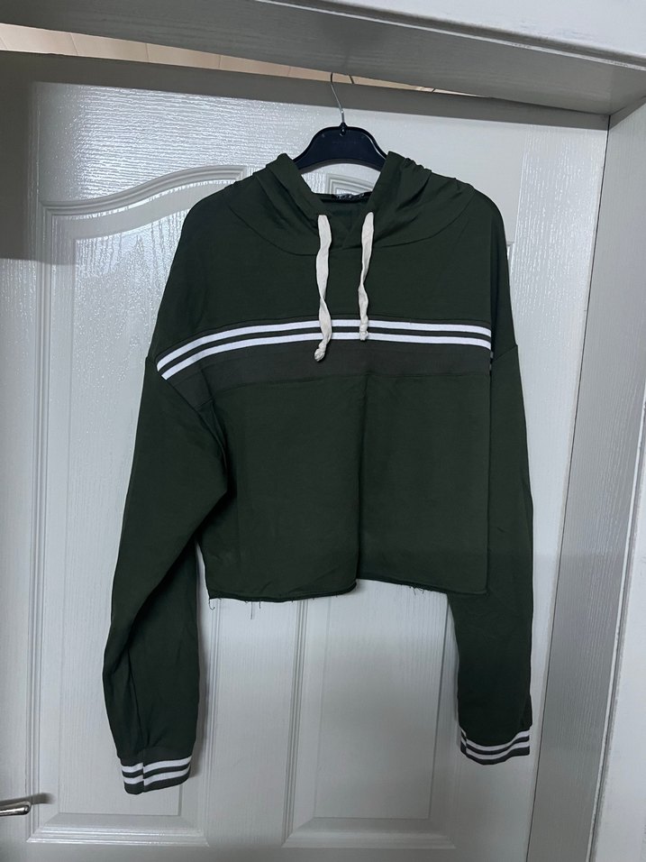 Koyu yeşil renkte, uzun kollu, bisiklet yaka ve bol kesimli kemerli sweatshirt. Göğüs ve manşetlerde çizgili detaylar bulunur.