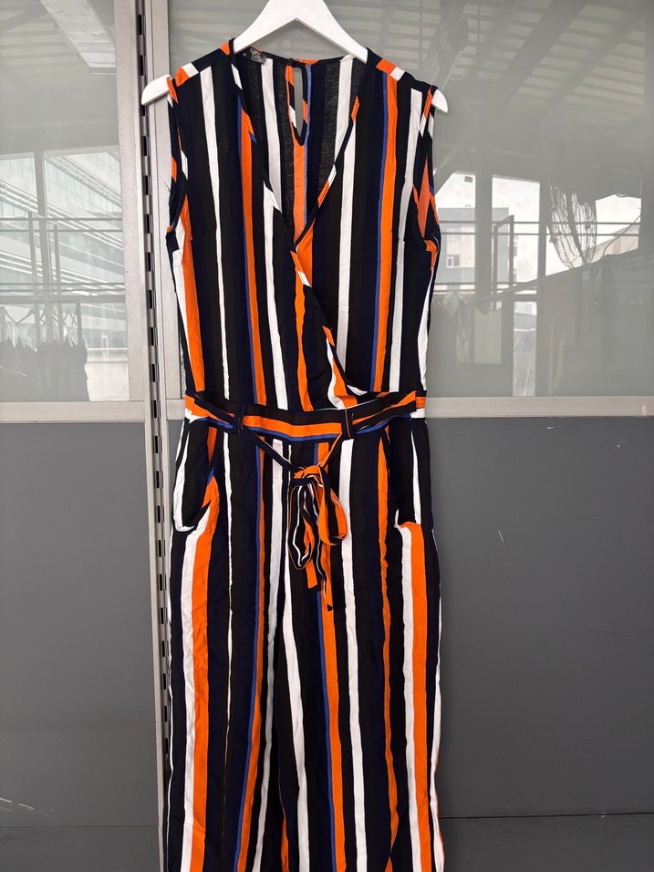 V yaka, askılı, kemerli, çizgili kadın uzun tulum. Çok renkli ve sentetik kumaştan üretilmiştir. Günlük rahat tarz için uygundur. Arka kolu kısmında ufak deformesi mevcuttur ama kullanıma engel değildir o yüzden fiyatı uygun tutuyorum