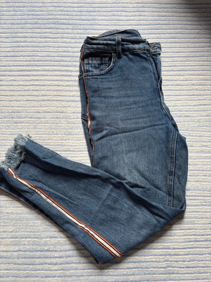 Kemerli ve yanları çizgili, normal boy ve regular fit mavi kadın kot pantolon, günlük rahat kullanım için uygundur.