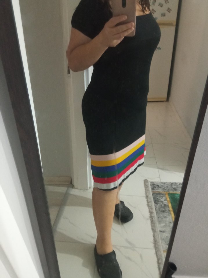 Çizgili, kemerli midi hamile etek elbise