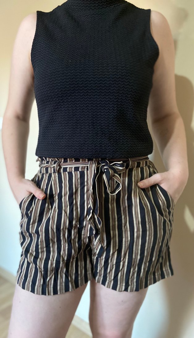 Kemerli, çizgili desene sahip, rahat kesim midi şort. Günlük rahat kullanıma uygundur.