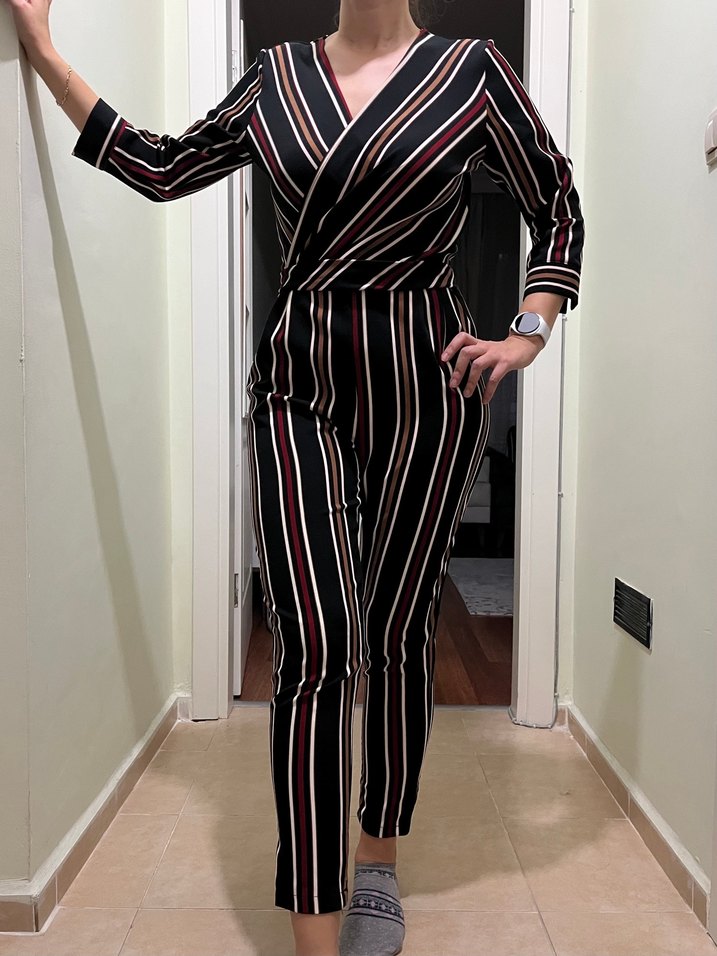 Kadınlar için çizgili, kemerli, notched lapel yakalı, uzun kollu midi tulum. Ofis için uygun, sentetik kumaştan, rahat ve şık.