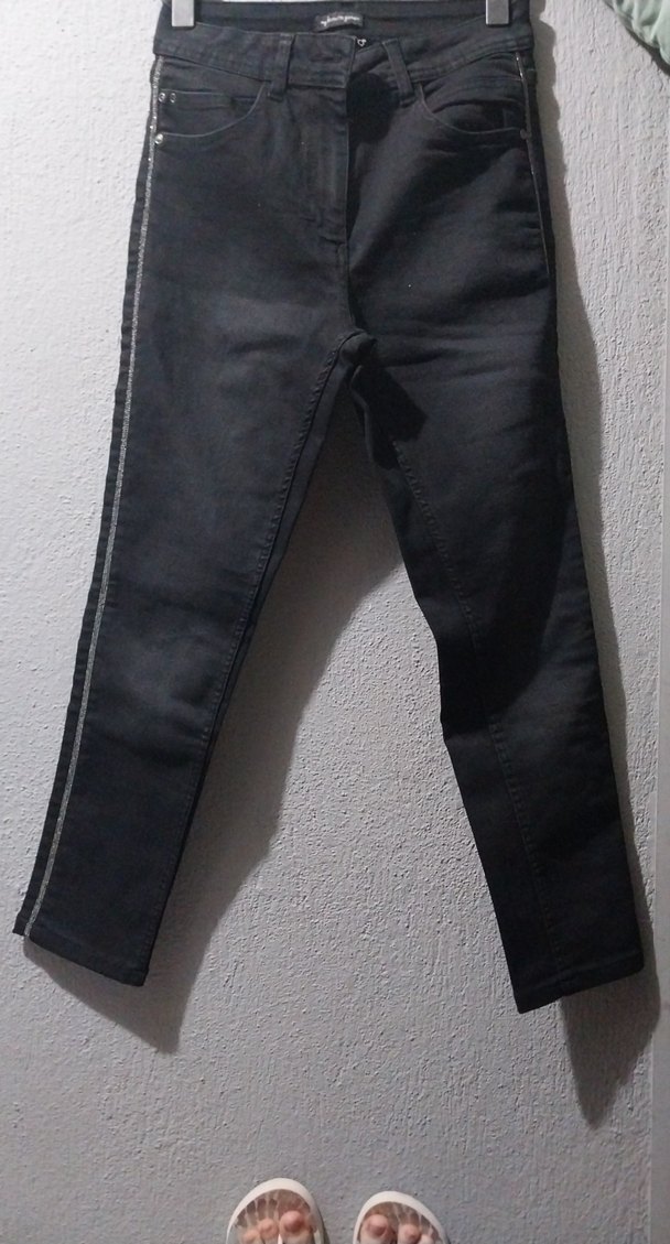 Siyah denimden yapılmış, normal kesim ve midi boy kadın kot pantolon. Kemerli bel ve yanlarda gri çizgili detaylar bulunur, günlük kullanıma uygundur.