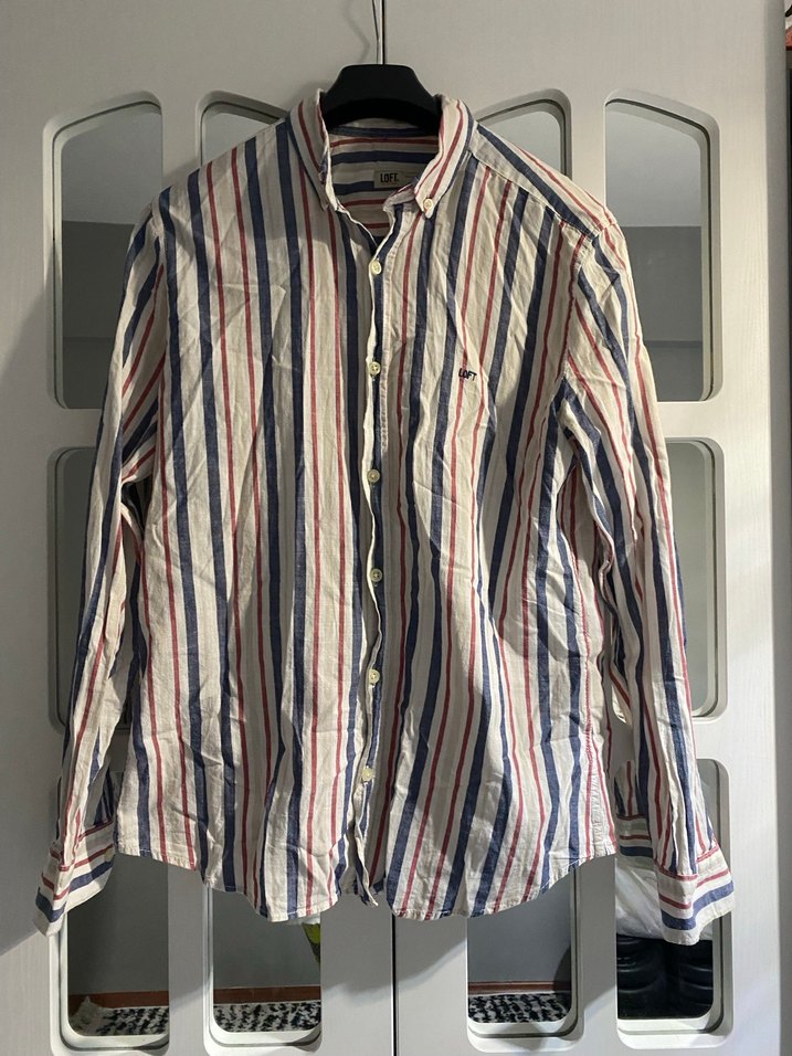 Uzun kollu, yakalı, keten kumaştan yapılmış, çok renkli çizgili erkek gömleği. Regular fit ve düğmeli, günlük sokak stiline uygun.