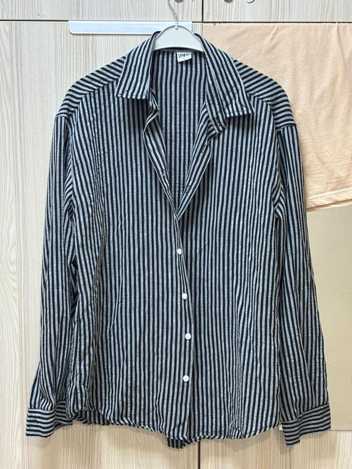 Çizgili Keten Gömlek, Uzun Kollu, Düğmeli
