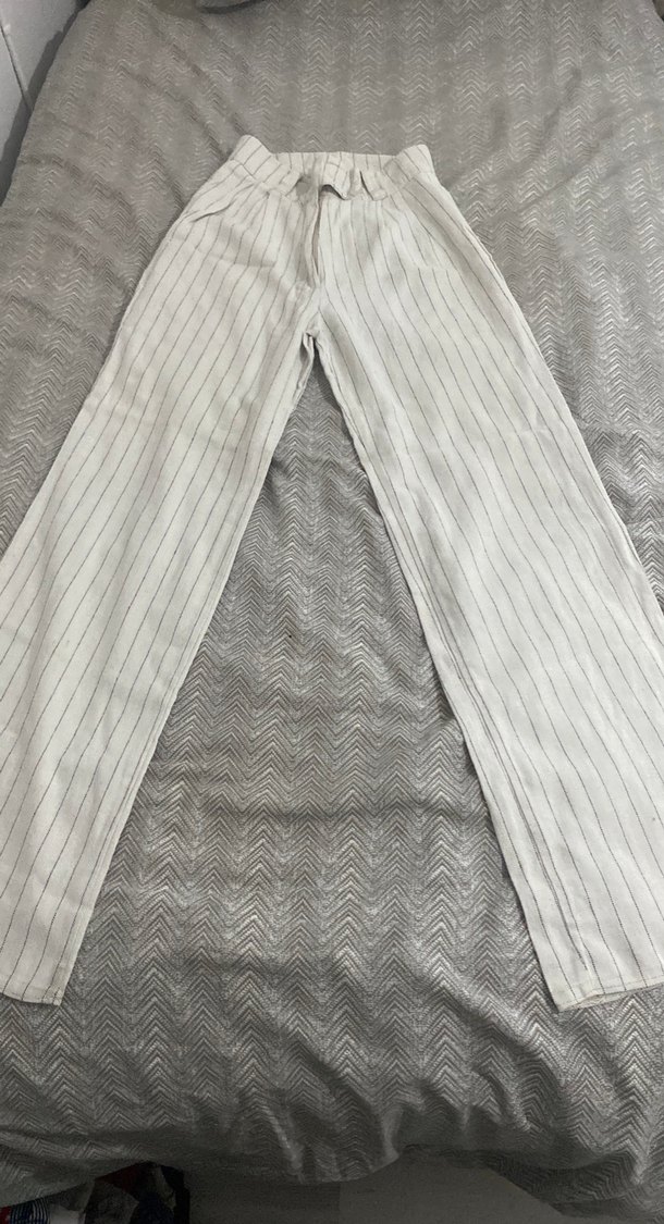 Yumuşak keten kumaştan, gri çizgili ve pileli detaylara sahip, minimalist tarzda regular fit midi pantolon. Önünde belli belirsiz küçük lekw var fotoğrafta belli