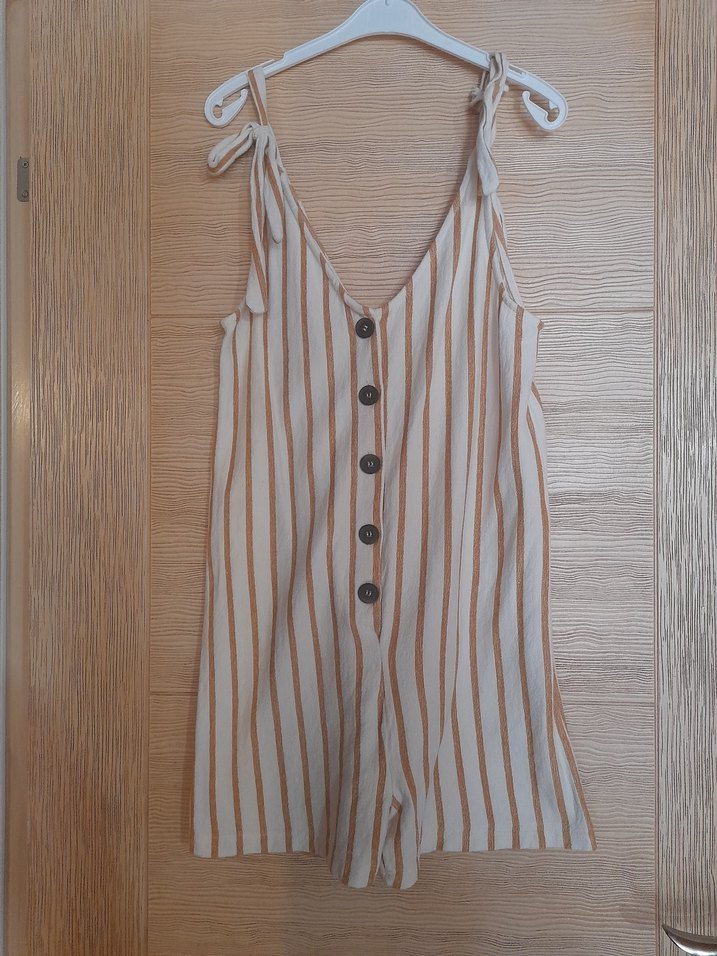 Yumuşak keten kumaştan, düğmeli, askısız kısa tulum. Gevşek kesim ve pastel bej çizgili deseniyle günlük bohem tarzı sağlar.