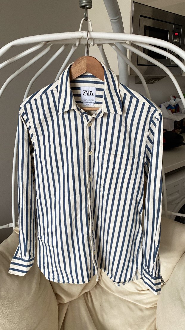 Zara markalı, keten kumaştan yapılmış, çizgili, uzun kollu ve düğmeli ön cep detaylı normal kesim gömlek. Günlük kullanıma uygun.