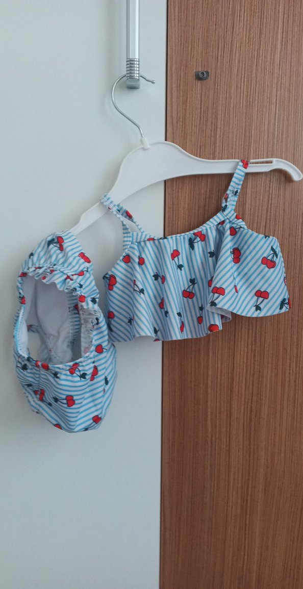 Çizgili mavi kumaş üzerine renkli kiraz desenli, askılı kız bikini. Plaj için bohem tarzda tasarlanmıştır.