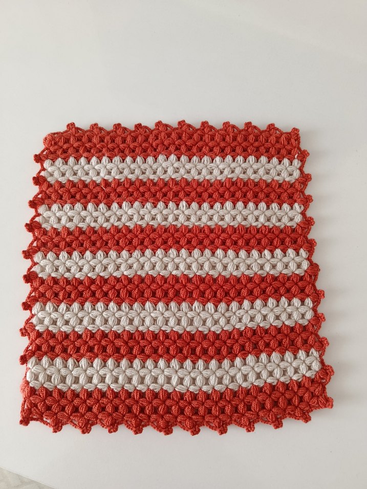 Canlı kırmızı ve beyaz çizgili, dokulu ve el yapımı görünümde banyo lifi.