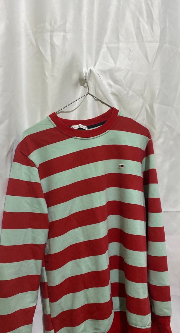 Uzun kollu, bisiklet yaka erkek sweatshirt. Kırmızı ve açık renk çizgili, rahat kesim, yumuşak örgü kumaştan. Günlük kullanıma uygun.