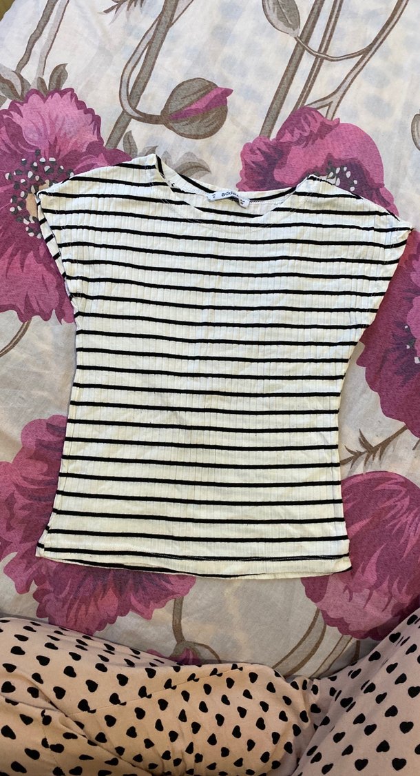 Kısa kollu, tekne yakalı, pileli ve çizgili tasarıma sahip bluzu. Beyaz sentetik kumaş üzerinde koyu çizgilerle, trend sokak stiline uygun.