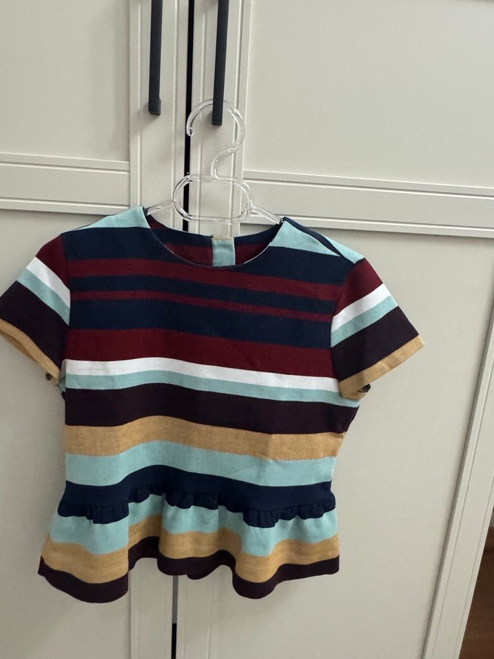 Çok renkli yatay çizgilerle ve etek ucu pile detaylarıyla kısa kollu, bisiklet yaka, dar kesim hamile bluzu. Hiç bir sorunu yok hamileler için de uygun