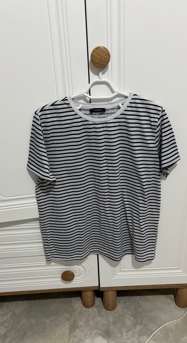 Beyaz üzerine siyah çizgili, kısa kollu, yuvarlak yaka ve normal kesim kadın tişörtü, yumuşak sentetik kumaştan, günlük rahat kullanım için uygun.