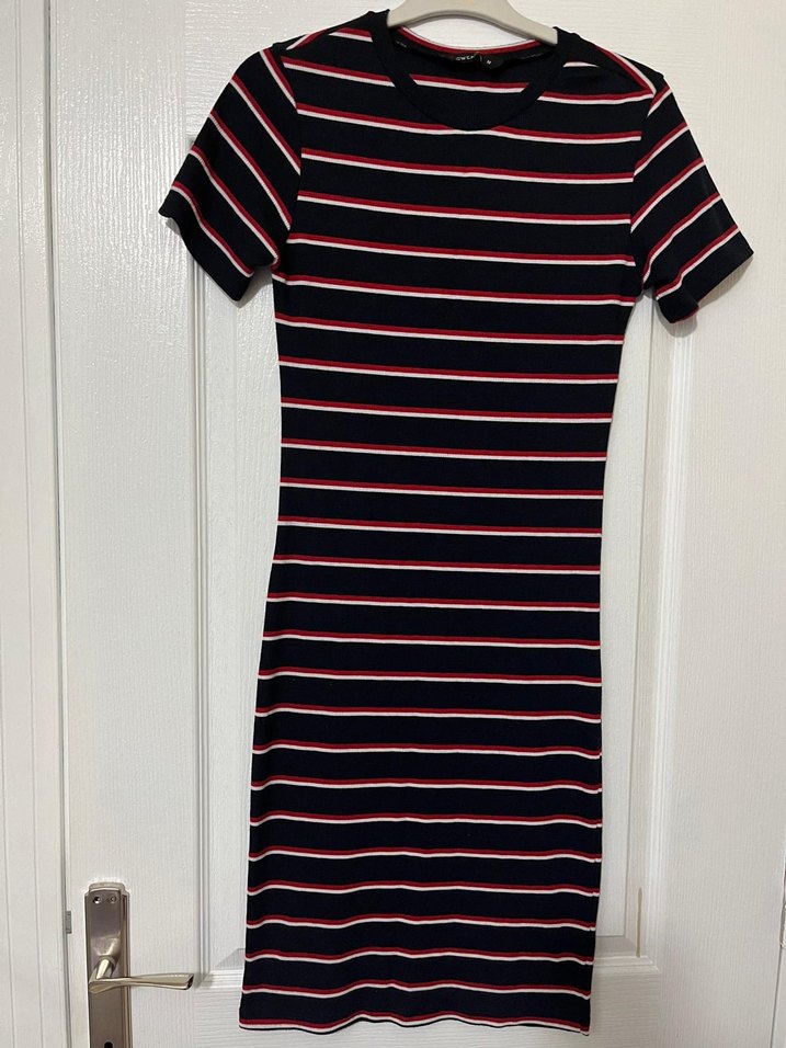 Sentetik kumaştan, kısa kollu ve tekne yaka, pile detaylı, çok renkli koyu çizgili, vücuda oturan midi elbise. Günlük kullanım için uygundur.