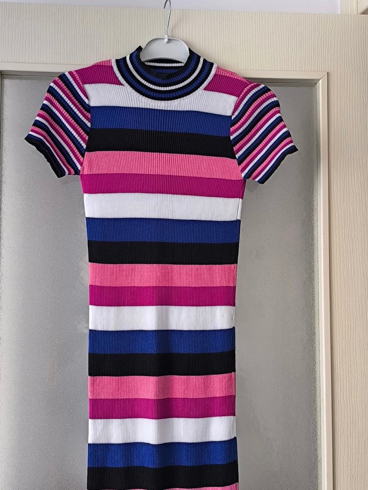 Renkli yatay çizgiler, yüksek yaka ve kısa kollu, vücuda oturan midi boy triko elbise. Trendy günlük kombinler için uygun.