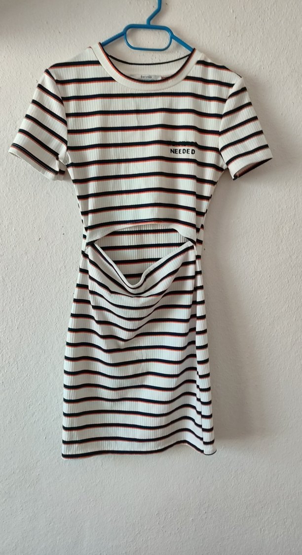 Kısa kollu, bisiklet yaka, çizgili beyaz,çizgileri lacivert ve turuncu mini elbisedir. Günlük kullanıma uygundur. boy uzunluğu toplam 75 cm.