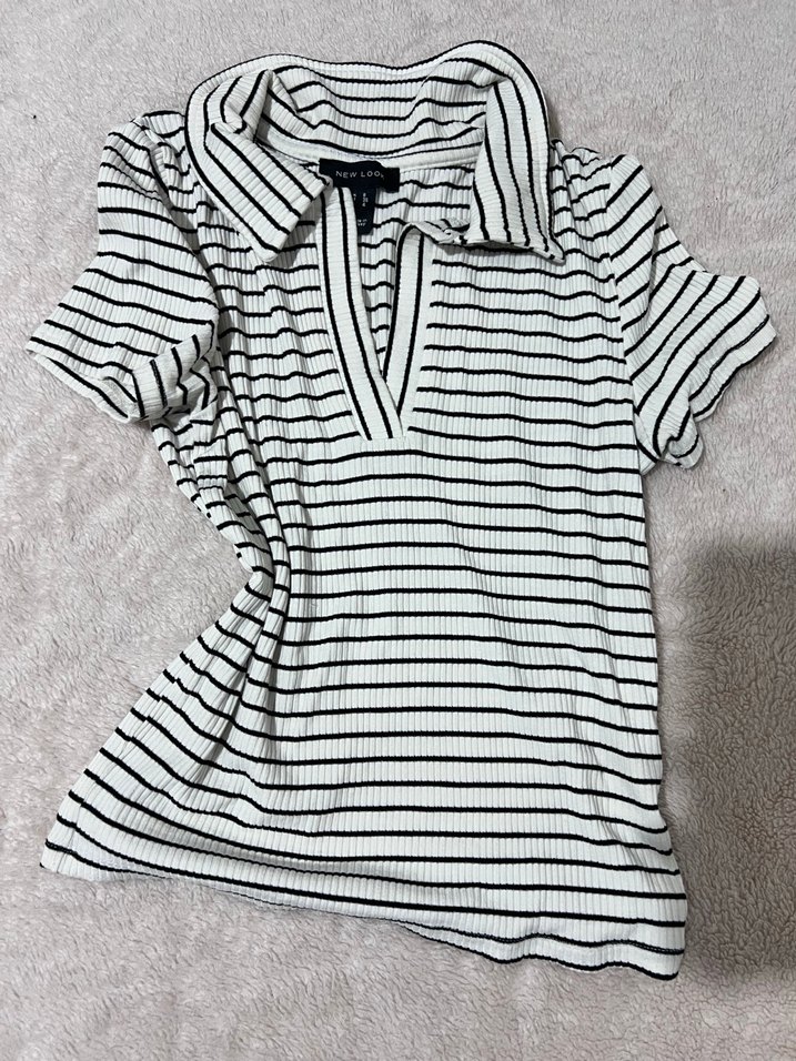 Pamuklu kumaştan yapılmış, çizgili, kısa kollu ve yakalı, pile detaylı kadın gömleği. Günlük kullanım için uygun, rahat kesim.