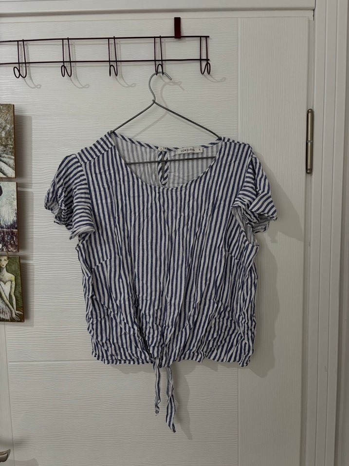 Gri çizgili, kısa kollu, salaş kesim, tekne yaka ve pilili detaylara sahip keten bluz. Günlük sokak stili için uygundur.