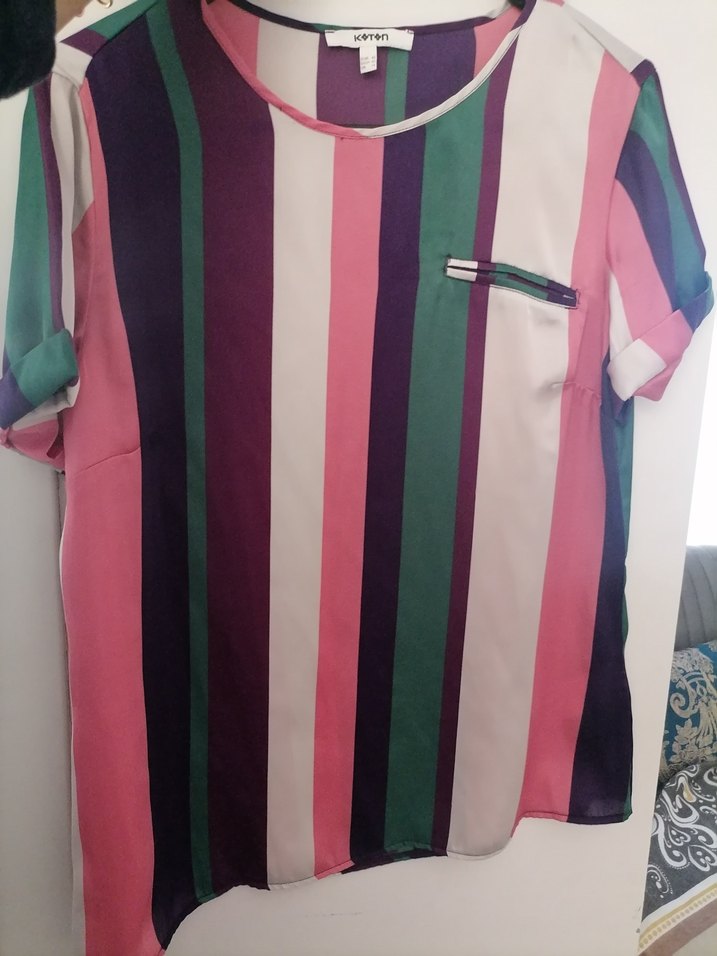 Kısa kollu ve yuvarlak yakalı, çok renkli pastel çizgili salaş kadın bluz. Sentetik yumuşak kumaştan, drapeli detaylı, günlük sokak stili için uygun.