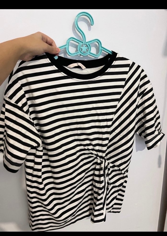 Pamuk kumaştan, kısa kollu ve bisiklet yaka olan bu tişört, çizgili deseni ve kemer detayı ile rahat bir görünüm sunar. Günlük kullanıma uygundur.
