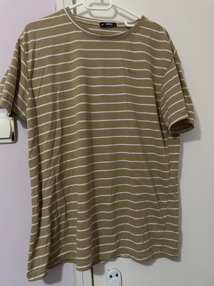 Kısa kollu, bisiklet yaka erkek bej çizgili tişört. Pamuk kumaştan, rahat kesimli ve günlük sokak stili için uygundur.