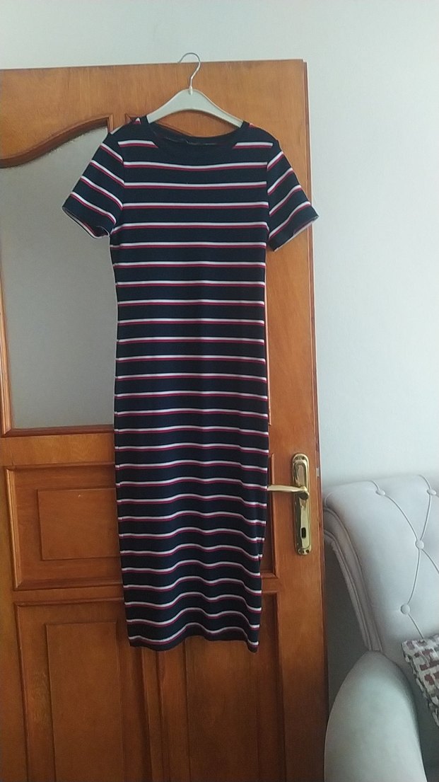 Kısa kollu, tekne yaka ve yan yırtmaçlı, çizgili uzun ve vücuda oturan elbisedir. Koyu renkli çok renkli desene sahip, sentetik kumaştan yapılmıştır.