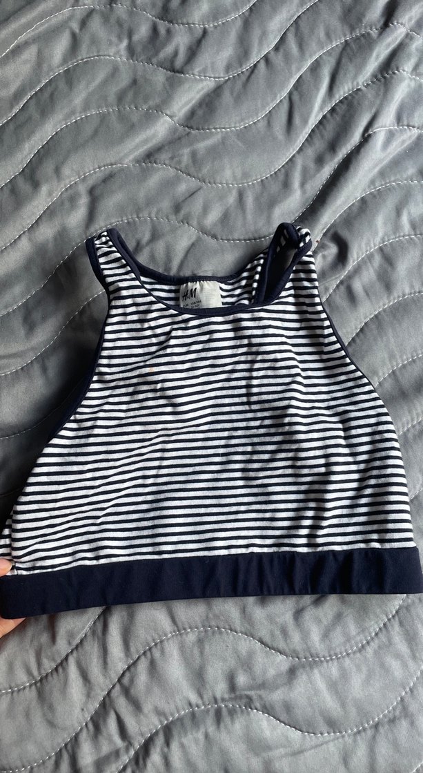 Kız çocuk atlet, ince yatay lacivert ve beyaz çizgilerle, alt kısmında düz lacivert bantla tasarlanmıştır. İnce askılı, yumuşak ve rahat kumaştan üretilmiştir.