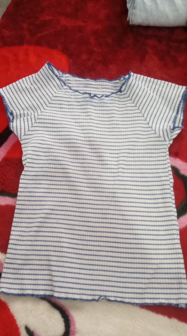 Kısa kollu, çizgili kız çocuk tişörtü. Yuvarlak yakalı ve yumuşak dokuludur, günlük kullanım için uygundur.