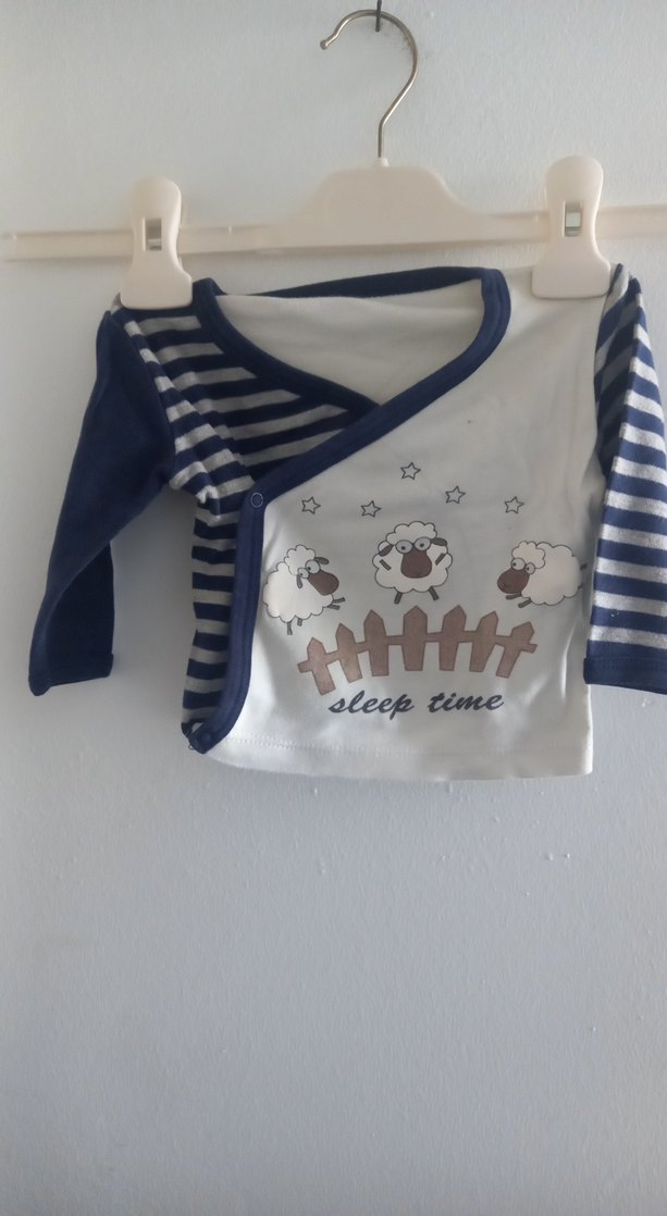 Uzun kollu, lacivert ve beyaz çizgili, önünde 'sleep time' yazılı koyun baskısı bulunan beyaz bebek atlet.