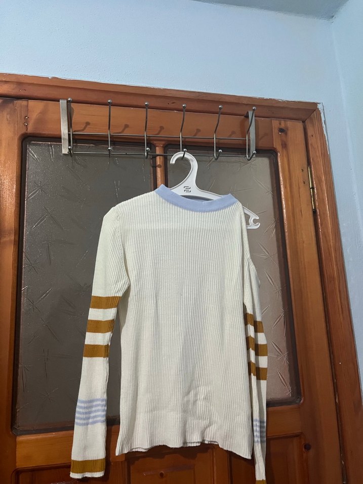 Çizgili Kollu Beyaz Triko Kadın Kazak