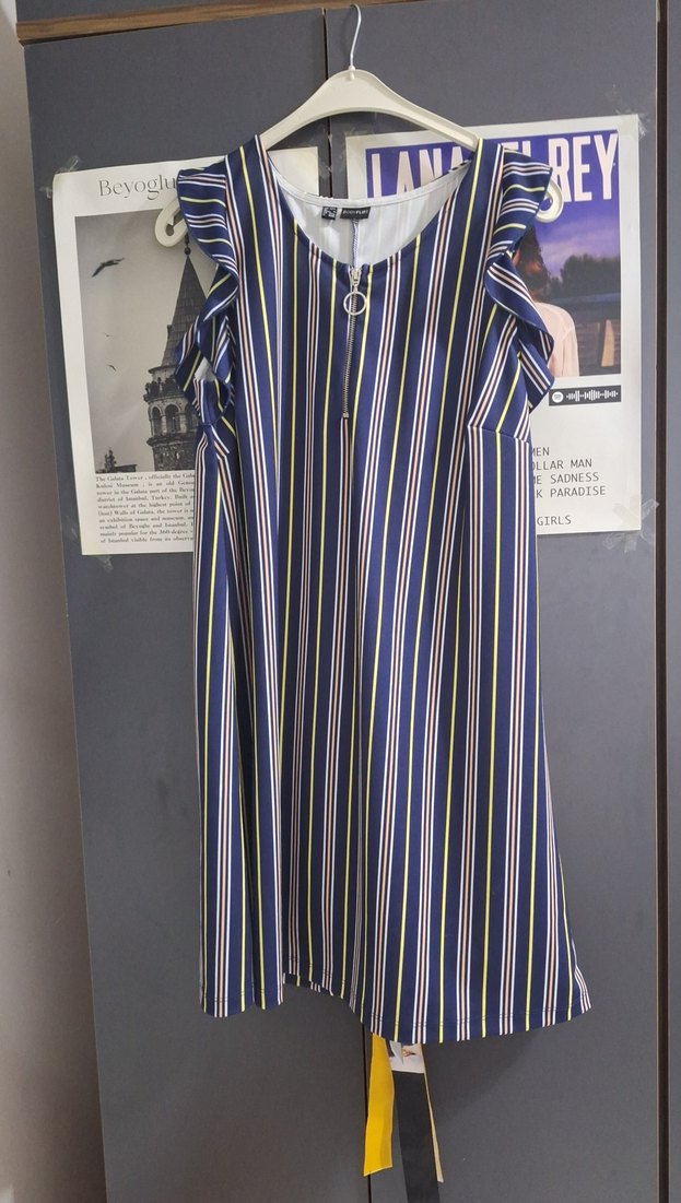 Çizgili, kolsuz, tekne yaka ve pileli tasarıma sahip rahat kesim elbise. Günlük kullanım için yumuşak sentetik kumaştan yapılmıştır.