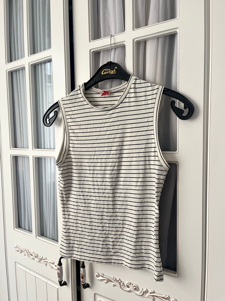 Pamuklu kumaştan, çizgili, kolsuz ve kısa kesim, beyaz ve gri renklerde, rahat ve şık bir kadın atleti. Hiç giyilmemiştir