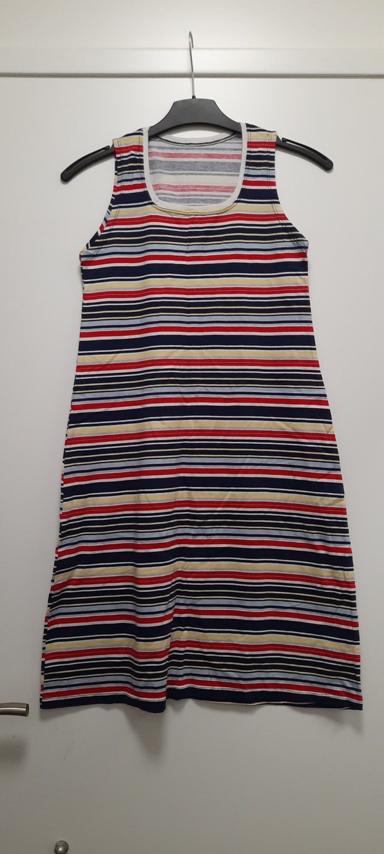 Çok renkli çizgili, kolsuz kadın elbisesi. Yumuşak sentetik kumaştan üretilmiştir. Hiç giyilmedi üzerinde beden yazmıyor ölçüye göre S bedene uyar. iki kol altı 38 cm omuzdan uca boy 91 cm dir