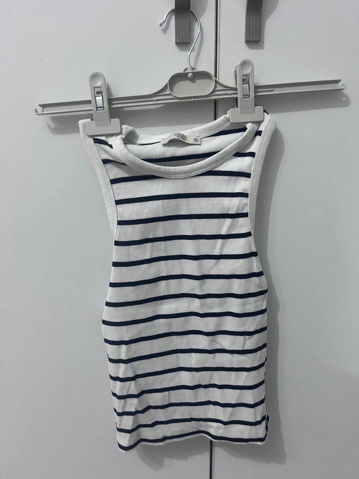 Pamuk kumaştan, kolsuz ve yüksek yakalı, kısa ve dar kesim çizgili crop top. Beyaz zemin üzerinde gri çizgilerle günlük sokak tarzına uygun.