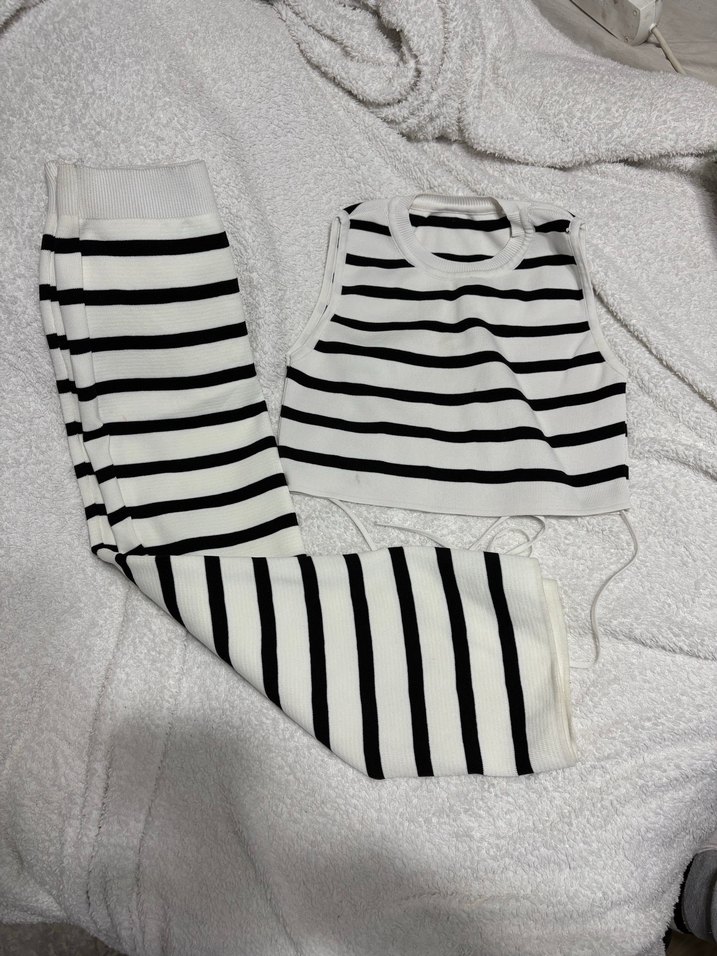 Siyah beyaz çizgili, kolsuz, tekne yaka triko elbise. Yumuşak sentetik kumaştan, midi boy ve rahat kesimle günlük şıklık sağlar.