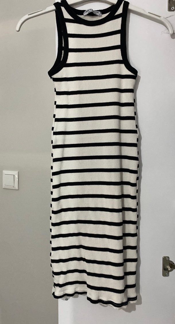 Kolsuz, yüksek yakalı ,siyah beyaz çizgili, yumuşak sentetik kumaştan yapılmış dar kesim uzun elbise.