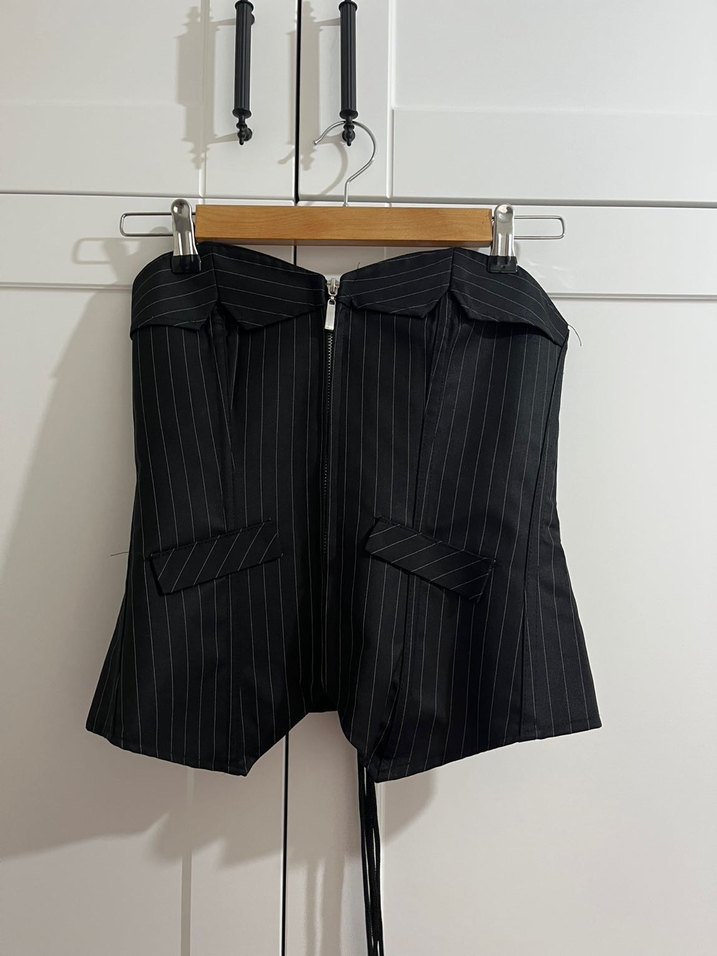 Çizgili siyah mini kadın takımı, straplez yakalı korse, regular fit. Sentetik kumaştan, ofis ve sokak modasına uygun.