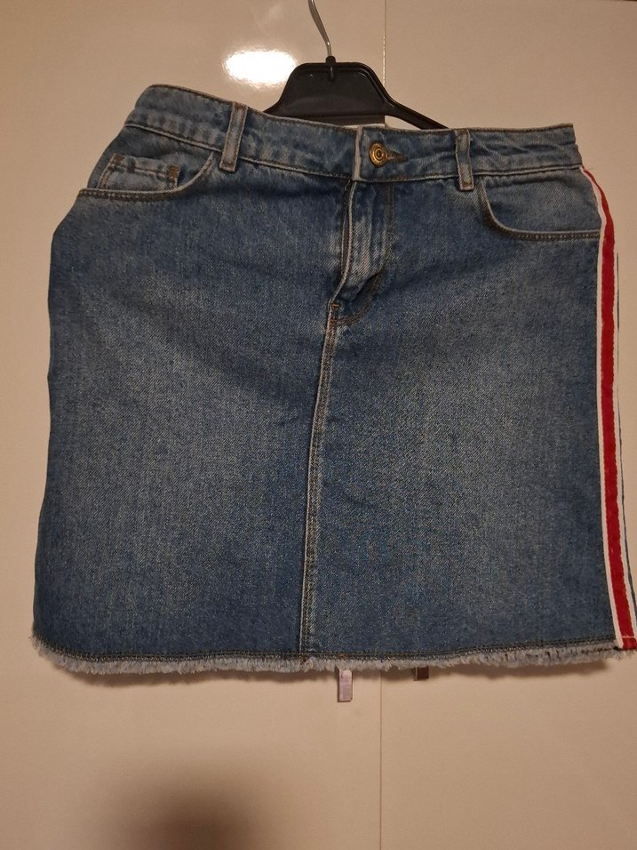Mavi kot mini etek, regular fit ve kemerli bel ile. Gri çizgili yan detaylarıyla sokak tarzı, günlük kullanıma uygun. Hiç giyilmedi sıfır ürün