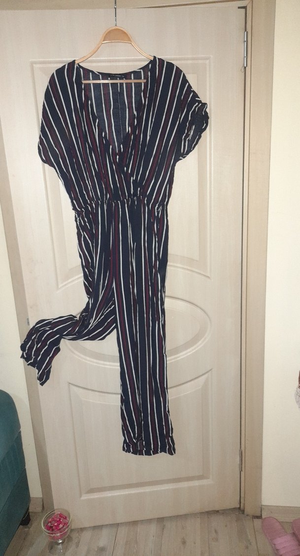 Kadınlar için uzun, bol kesim tulum. Renkli cizgili detayları, kruvaze yakası bulunur. Koyu renkli çok renkli çizgili deseni ve sentetik kumaşıyla rahat bir sokak stili sunar. iki kol arası 60 cm omuzdan paça bitimine 144 cm